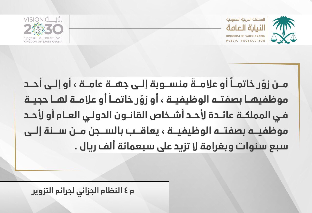 ا لـ ـنـ ـيـ ـا بـ ـة ا لـ ـعـ ـا مـ ـة On Twitter النيابة العامة تقليد خاتما أو علامة منسوبة إلى جهة عامة أو إلى أحد موظفيها بصفته الوظيفية تعد